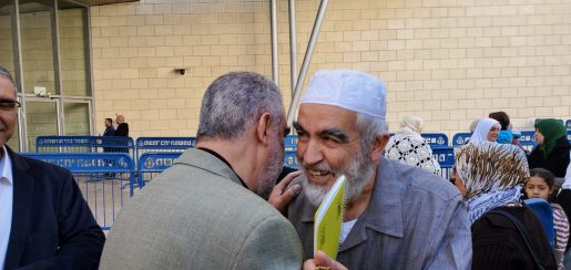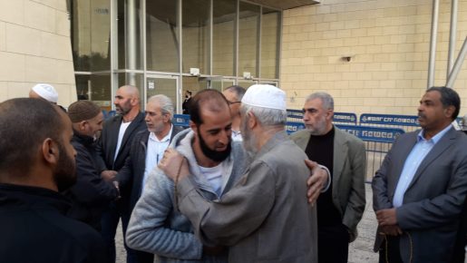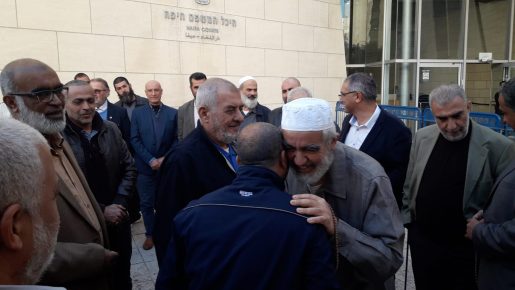 العشرات يستقبلون الشيخ رائد صلاح بالهتافات والعناق بعد وصوله إلى منطقة المحاكم في حيفا حيث تعقد جلسة المرافعات في ملف "الثوابت".