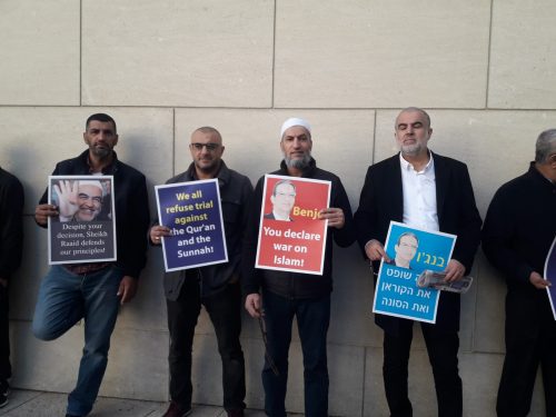 هتافات منددة بسياسات الاحتلال في الأقصى من أمام مبنى المحاكم في مدينة حيفا حيث تعقد جلسة المرافعات في "ملف الثوابت" الذي يحاكم فيه الشيخ رائد صلاح.