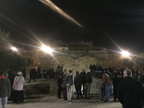 ونقل عن شهود عيان قولهم إنّ شرطة الاحتلال رشّت المصلين بغاز الفلفل بعد الإفطار، واعتقلت الشاب محمد الشاويش، ولاحقت الشبان الذين هربوا إلى داخل مصلى باب الرحمة وأغلقوا بوابتيه عليهم.