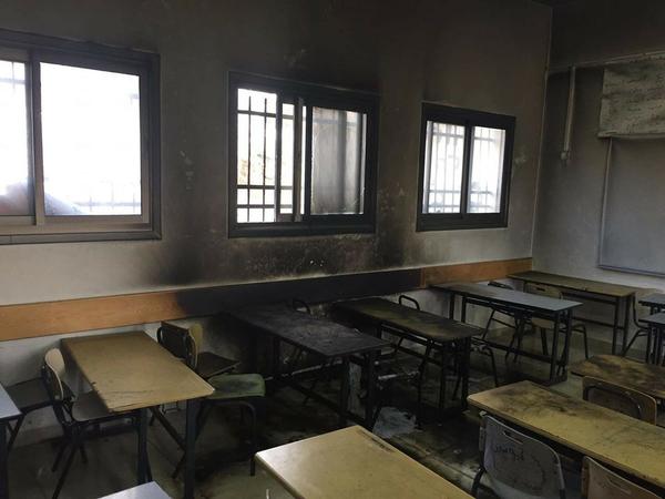 مستوطنون يحرقون صفًّا مدرسيًّا في عينابوس جنوب نابلس