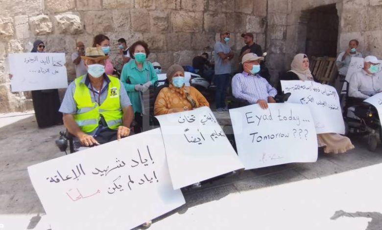 ورفع المشاركون صورة ضخمة للشهيد الحلاق وعبارة “إياد الحلاق شهيد الإعاقة”، وشعارات بعنوان” الاشخاص ذوي الإعاقة المقدسيين يستحقون العيش الكريم”، و”إعاقة إياد كانت سبب إعدامه”.