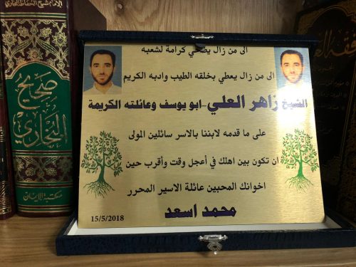 زاهر علي: في هذا السياق أود أن أحدثكم أنه قد كانت زيارة للشيخ رائد صلاح حفظه الله لبيت الأهل مع ثلّة طيبة من الأسرى وهناك صعد هذا اللقب وعندما نزل الخبر في جريدة “صوت الحق والحرية” كنت أتقلى الجريدة في سجن “جلبوع” فلمّا استلمت العدد الذي كتب فيه عن زيارة الشيخ والأسرى لبيت العائلة وكان في العنوان لقب معلم الأسرى قمت بإخفاء هذا العدد ولم أوزعه في القسم ولم أطلع أحدا على العدد والخبر إلا الأخ حمزة الكالوثي “أبو جعفر” وقد كنت محرجا كثيرا خصوصا أنني لا استحق هذا اللقب. كل الذي قمت فيه بالأسر ليس لي فيه منّة على أحد، لم أقم إلا بواجبي ولعلي قصّرت أيضا في أداء هذا الواجب أحيانا، بكل الأحوال جزاهم الله كل خير أولئك الذين أطلقوا عليّ هذا اللقب، فأنا أقدّر محبتهم لي واعتز بها.