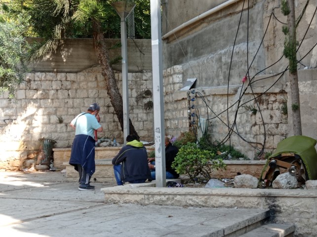هؤلاء الأشخاص، بائعو ومدمنو المخدرات، ممنوع أن يتمركزوا هنا، تصرفاتهم غير لائقة ولا تليق بالمسجد وحرمته ولا بساحة عامة. نحن لا نستطيع أن نتحدث معهم ولا أن نمنعهم من اتخاذ هذا المكان مقرا ووكرا لهم، لا نستطيع وهذه الحقيقة.. تحدثنا من قبل مع البلدية والشرطة ولا أحد تجاوب معنا للأسف الشديد. هذا المكان ضرر على المسجد أيضا من سلوكهم وتصرفاتهم وأعمال أخرى مزعجة جدا يفعلونها خلال اليوم والليلة. هذا عدا عمّا يصدرونه من صراخ وأصوات مزعجة والشتائم وسب الذات الإلهية والتصرفات غير الأخلاقية.. أضف إلى ذلك أنهم لا يغتسلون ولا يستحمون وهذا يعمل يجلب الأمراض، يأكلون ويرمون الفضلات في المكان الذي ينامون فيه هذا عدا أنهم يقضون حاجاتهم أيضا في نفس المكان!! نحن كأفراد لا نقدر أن نمنعهم أو أن ننظف الساحة منهم ومن اوساخهم ووبائهم، بحاجة لقوة ولتعاون كبير من الجميع. أحينا يكونون مجموعة صغيرة من أفراد وأحيانا مجموعة كبيرة يتجاوز عددها الـ 15، يزيدون وينقصون لكنهم لا يتركون هذا المكان أبدا لأنه المكان الوحيد الذي يأويهم. لماذا هذا يحدث؟ لا أستطيع أن أفهم.. وإذا دخلوا المسجد واستعملوا الحمامات والمراحيض من الممكن أن يوسخوا المكان وينقلوا امراضهم ووباءهم إلى المسجد. وهذا غير مقبول. لا تستطيع أن تتفاهم معهم هم بغير وعي وعندما يتعاطون المخدرات والسموم يفقدون الوعي. بالأمس طلبت من أحدهم أن يخفض صوته بأدب وقلت له لو سمحت أنت بجانب مسجد وله حرمة، فكانت ردة فعله عنيفة جدا ورد علي بالصراخ وسب الذات الإلهية والشتائم بالألفاظ البذيئة على المصلين والمشايخ والناس أجمعين.. أنا ألوم أولا الأهل الذين لم يربوا التربية الصحيحة وتركوا أولادهم إلى مثل هذا الحال..