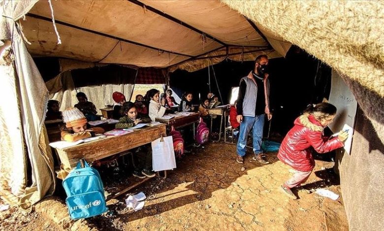 يحوّل سكان مخيم الريان من النازحين السوريين في محافظة إدلب، خيمهم إلى مدرسة في ساعات معينة من اليوم، لتمكين أبنائهم من مواصلة مسيرتهم التعليمية.