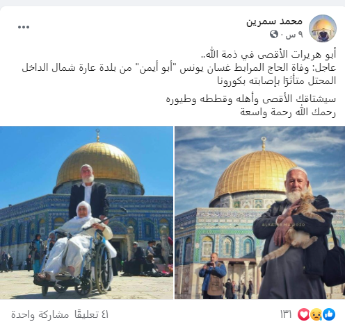 أوقفت جائحة كورونا، اليوم الثلاثاء، مسيرة حافلة بالرباط في المسجد الأقصى، للشيخ غسان رفقي يونس (74 عاما) من قرية عارة، حيث أعلن عن وفاته صباحا متأثرا بمضاعفات إصابته بفيروس كورونا المستجد.