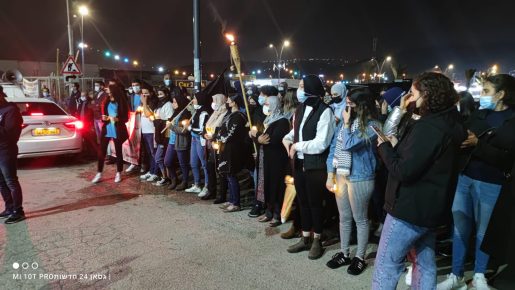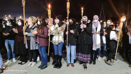 ورفع المشاركون المشاعل ورددوا شعارات ضد العنف والجريمة.