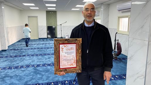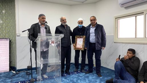 ثم كانت فقرة تكريم للشيخ أحمد أبو شعلة مركز ومدير العمل في بناء المسجد، وتم منحه شهادة شكر وتقدير على تفانيه في خدمة المسجد حيث واصل العمل ليلا ونهارا حتى أنجز على أكمل وجه.