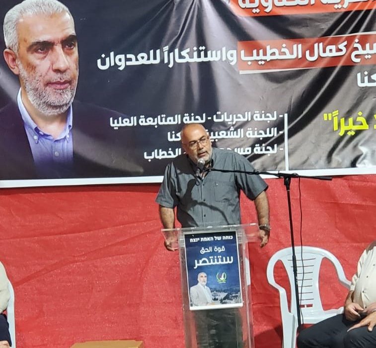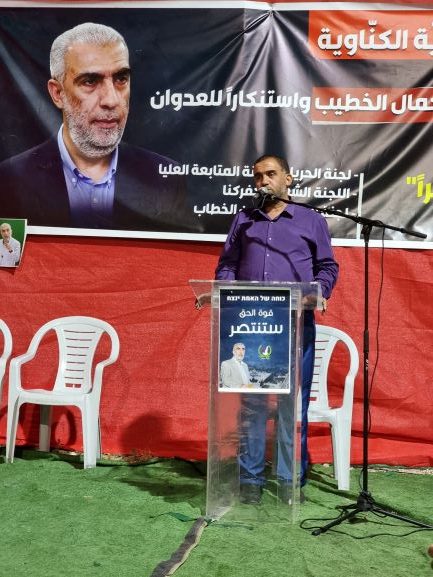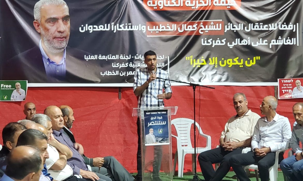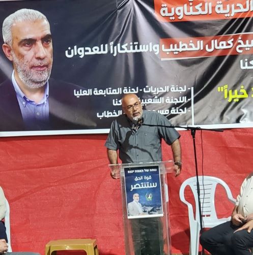 وقد قدمت في الخيمة كلمات قيمة من الحضور، أكدوا فيها ان اعتقال الشيخ كمال هو ملاحقة سياسية خالصة تهدف لإسكات كل صوت يناضل ضد سياسات دولة اسرائيل العنصرية التي تستهدف الوجود العربي في هذه البلاد، وتقمع حقوقهم وحرياتهم وخاصة حرية العبادة وحرية التظاهر بل وحق العيش بكرامة.