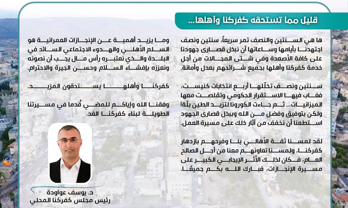 وأضاف: ” لقد سرنا ووجهتنا نحو الهدف الواضح، وهو النهوض بهذا البلد الطيب، فأعددنا لذلك الخطط والبرامج المهنية، وطرقنا أبواب الوزارات للمطالبة بحقنا بالميزانيات، ثم تابعنا ونفذنا… واتخذنا القرارات بكل حزم وعزم دونما انشغال بمعارك جانبية. وها أنا اليوم وبعد انقضاء السنتين والنصف أنقل عصا “سباق التتابع” لأخي عز الدين أمارة ليكمل الركض قُدما سنتين ونصف أخرى، سائلا المولى عز وجل أن يسدد الخُطى. وسيكون من واجبي أن أضع كامل خبرتي أيضا في هذه المرحلة خدمة لبلدي وصالحها العام، وخدمة لمجتمعي العربي في داخلنا الفلسطيني. حفظ الله كفركنا وأهلها وسائر بلاد العالمين. د. يوسف عواودة، ابن كفركنا وابن الداخل الفلسطيني”.