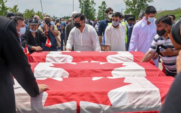 وقال رضا بشير ترار، السفير الباكستاني لدى كندا، خلال الجنازة، إن “الحقيقة الساطعة المتمثلة في لف النعوش بالعلم الكندي هي شهادة حية على حقيقة أن الأمة الكندية كلها تقف معهم”.