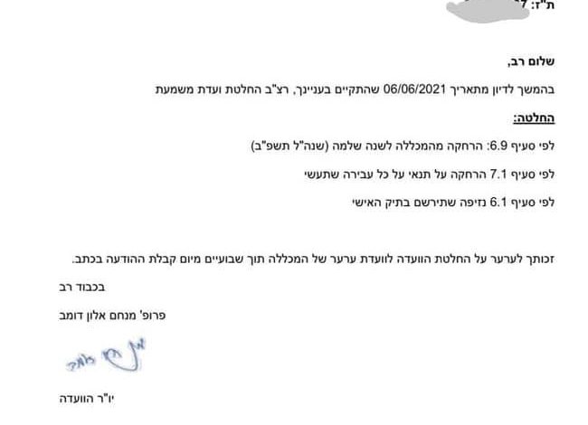 وكانت إدارة الكلية الاكاديمية اشكلون، سلّمت مؤخرًا، قرارًا بفصل طالبتين عربيتين مدة سنة كاملة على خلفية جدال سياسي دار بين طلاب عرب ويهود في مجموعات واتساب، بحسب ما عمم في وسائل الاعلام.
