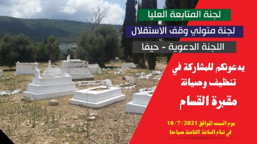 دعت لجنة المتابعة العليا للجماهير العربية ولجنة متولي وقف الاستقلال واللجنة الدعوية في حيفا، إلى أوسع مشاركة، يوم غد السبت، في “يوم العمل التطوعي” في مقبرة القسام في بلد الشيخ (تل حنان). كما انضمت إلى الدعوة هيئة الدعوة في مدينة أم الفحم.