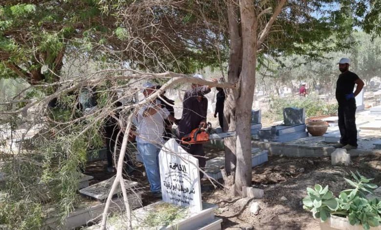 ورغم الحر الشديد، شارك حشد كبير من أهالي المدينة في العمل التطوعي، حيث نفذوا أعمال تنظيف المقبرة من الأعشاب وتقليم الأشجار وغيرها من الأعمال.
