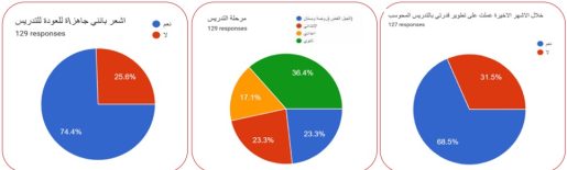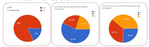 ويشير الاستطلاع إلى أن واحدًا من كل أربعة معلمين لا يشعر بأنه جاهز للعودة للتدريس، فيما أشار واحد من كل خمسة مشاركين فقط إلى أنه لا يشعر بالتخوفات من العودة للتدريس في ظل جائحة كورونا، فيما أفاد 25.6% فقط بأنهم يثقون بأهالي الطلاب بألّا يبعثوا طالبًا مصابًا بفيروس كورونا أو في حجر صحي إلى المدرسة.