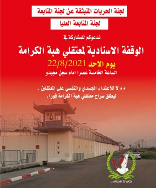 دعت لجنة الحريات المنبثقة عن لجنة المتابعة العليا، إلى المشاركة يوم غد الأحد (22/8/2021) في وقفة إسناد ومؤازرة لمعتقلي هبة الكرامة، وذلك أمام سجن “مجيدو” في الساعة الخامسة عصرا.