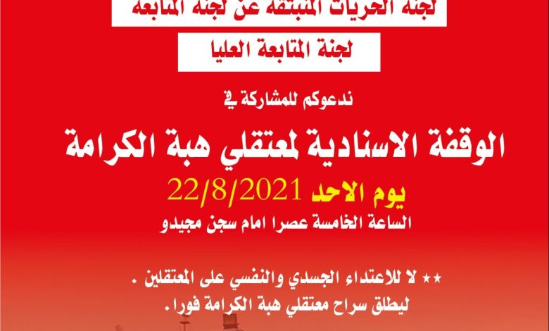 في ختام بيانها دعت لجنة الحريات “جميع القيادات إلى التحرك من أجل إنهاء هذا الملف، مع التأكيد على أن اللجنة ستتخذ خطوات شعبية دعما لقضية معتقلي هبة الكرامة”.