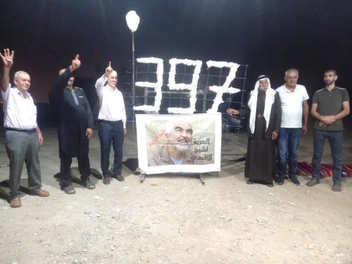وبحضور شيخ العراقيب، الشيخ صياح الطوري وعدد من أهالي العراقيب، والمحامي خالد زبارقة من طاقم الدفاع عن الشيخ رائد صلاح، أهالي قرية طرعان شعلة الحرية الـ 397 تضامنًا مع الشيخ رائد صلاح.