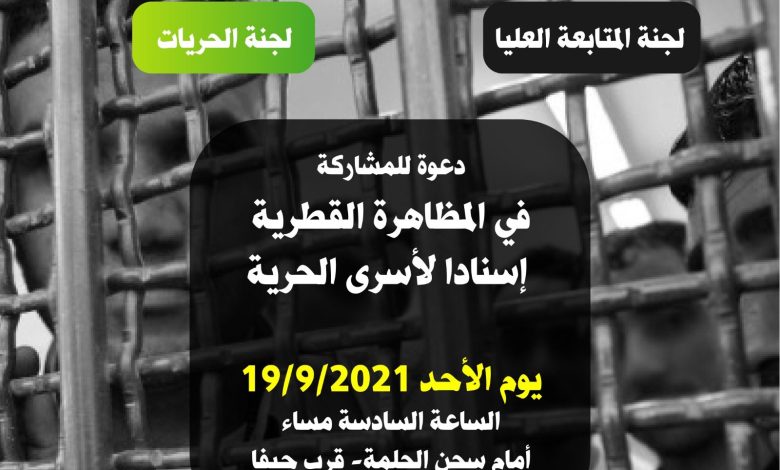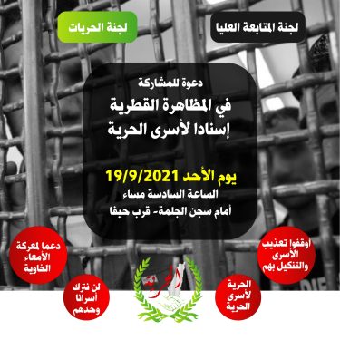 دعت لجنة المتابعة العليا للجماهير العربية في الداخل الفلسطيني ولجنة الحريات المنبثقة عنها، إلى المشاركة الحاشدة في المظاهرة القطرية الشعبية يوم الأحد القريب، الموافق 19/9/2021 في الساعة السادسة مساء أمام سجن الجلمة قرب حيفا.