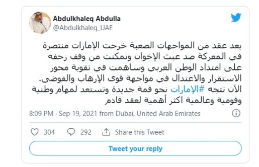 وفي تصريح نشره على صفحته الرسمية في موقع تويتر كتب مستشار الشيخ محمد بن زايد: “بعد عقد من المواجهات الصعبة خرجت الإمارات منتصرة في المعركة ضد عبث الإخوان وتمكنت من وقف زحفه على امتداد الوطن العربي”. وأضاف بلغة واضحة لا تحمل أي لبس أن الإمارات: “ساهمت في تقوية محور الاستقرار والاعتدال في مواجهة قوى الإرهاب والفوضى”. وأضاف في تغريدته أن أبو ظبي الآن تتجه نحو قمة جديدة وتستعد لمهام وطنية وقومية وعالمية أكثر أهمية لعقد قادم، على حد زعمه.