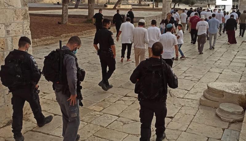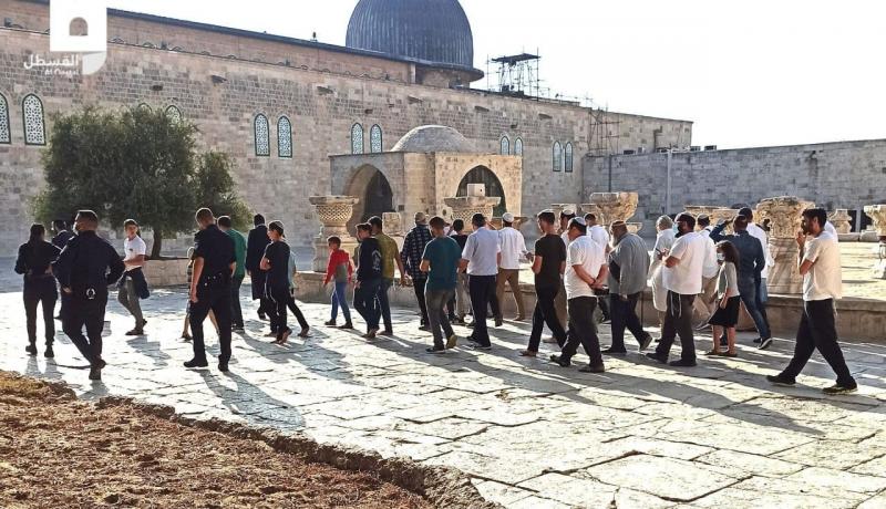 وأدى المستوطنون طقوسا تلمودية في باحات المسجد الأقصى، وفي انتهاك خطير أقدم مستوطن على رفع علم الكيان الإسرائيلي في الباحات. وأفادت مصادر محلية بأن قوات الاحتلال اعتقلت أحد الشبان لأنه يصلي في ساحات المسجد الأقصى بالتزامن مع اقتحامات المستوطنين.