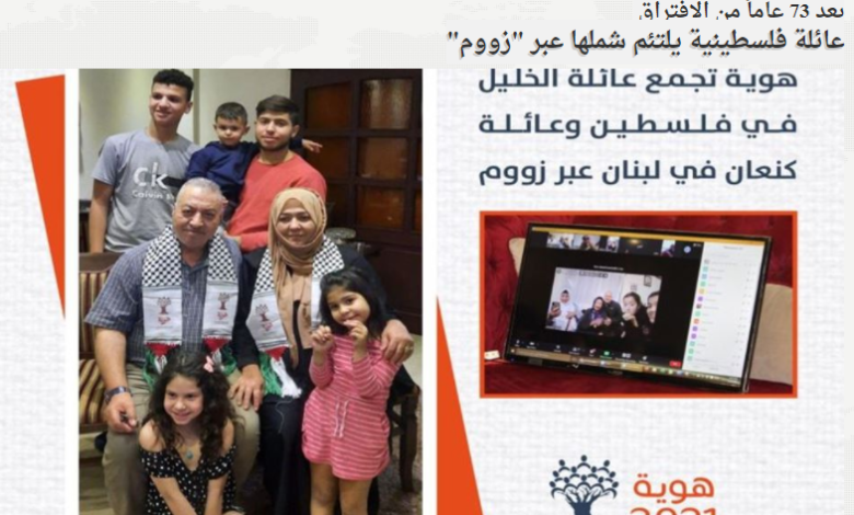 تمكّن المشروع الوطني للحفاظ على جذور العائلة الفلسطينية (هوية) من الجمع بين عائلتي الخليل في فلسطين، وكنعان في لبنان، عبر تطبيق زووم، وذلك بعد 73 عامًا من الافتراق.