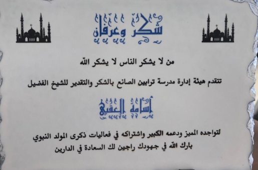 هذا وتقدم الشيخ أسامة العقبي بالشكر لهيئة إدارة مدرسة ترابين الصانع الثانوية بالنقب، وعلى رأسهم مدير المدرسة الاستاذ عبد الرازق الترابين والأستاذ وليد القرناوي على دعوتهم له لإلقاء محاضرة على شرف ذكرى مولد النبوي الشريف.