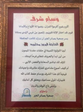 وقدمت جمعية بصائر الخير درعا تكريما لمعلمة القرآن فيروز محاميد والحفظة لكتاب الله جاء في نصّه: “يسر جمعية بصائر النور أن تبارك للأخت الحافظة (الحاجة فيروز محاميد).. أيتها اللؤلؤة الثمينة في حلقات عقدنا الميمون. من أين نبدأ والحروف تتطاير فرحا لتهنئتك.. لترف لك تباشير السعادة والفضل الإلهي.. أم كيف أصوغ مشاعري لتبارك مثابرتك واجتهادك فهنيئا لك هذا الشرف ووسام حفظ كتاب الله.. فليبارك لك المولى مساعيك ويحقق كل أمانيك ويُلبس تاج الوقار والديك”.