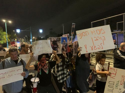 ورفع المتظاهرون لافتات منددة بسياسة الحكومة التي وصفوها بالعنصرية، كذلك لافتات تطالب بطرد المستوطنين من “النواة التوراتية” في اللد، وأخرى تخمل صور الشهيد.