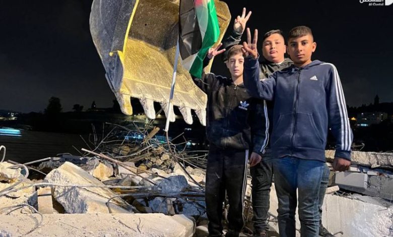 وقال أطفال المقدسي برقان بعد أن زرعوا العلم الفلسطيني فوق ركام منزلهم المهدّم: “هذه أرضنا ودارنا التي انهدت واحنا مش طالعين منها حتى لو أجى جيش الاحتلال”.