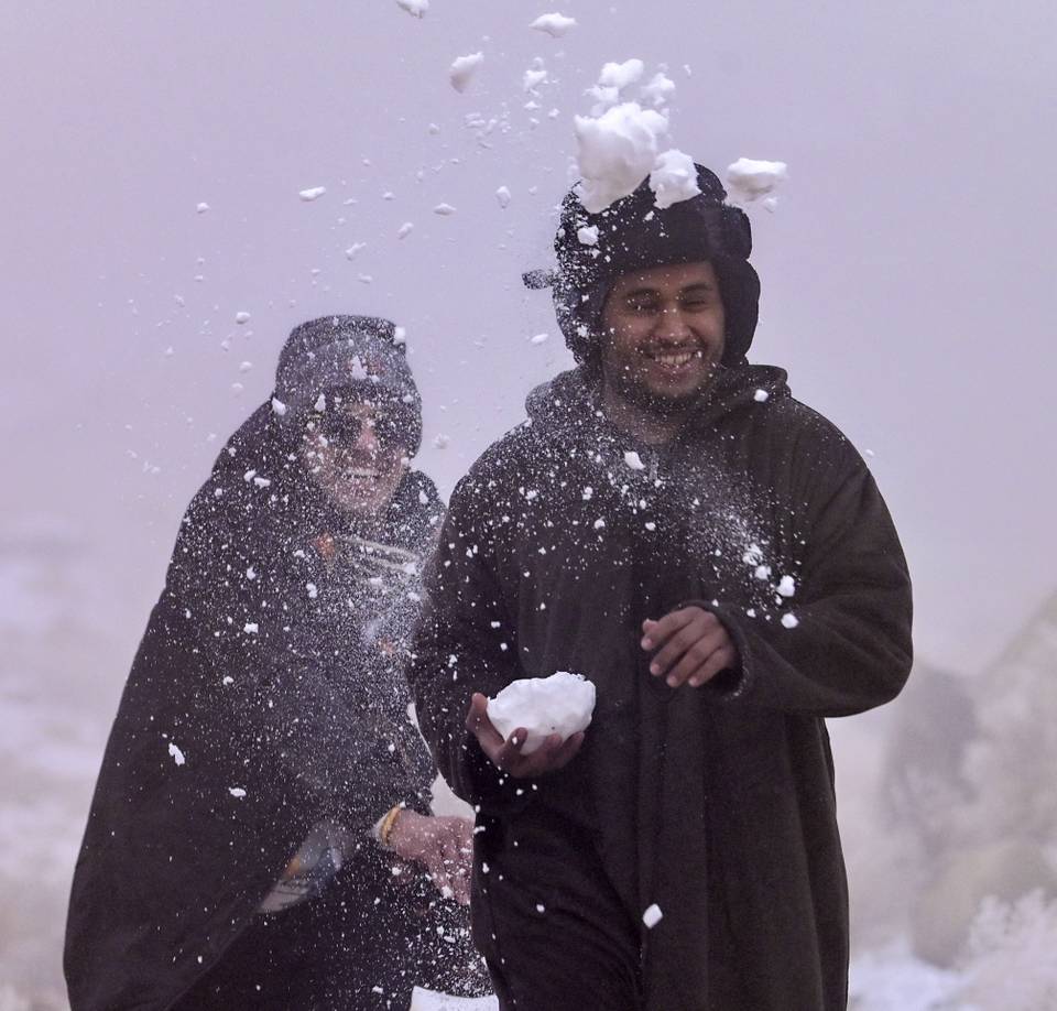 وفي تبوك في شمال غرب البلاد، غطت الثلوج جبل اللوز، ما دفع مئات الأسر السعودية إلى الخروج من أجل التنزه في تلك الأجواء المناخية المميزة.