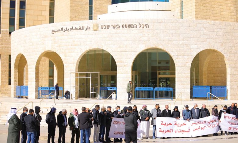 تظاهر عدد من الأهالي والناشطين السياسيين والقيادات العربية في النقب، صباح اليوم الجمعة، أمام مبنى المحاكم في مدينة بئر السبع، وذلك احتجاجا على استمرار حملات الاعتقالات التي تنفذها الشرطة الإسرائيلية منذ بداية الاحتجاجات على تجريف وتحريش أراضي النقب، وطالت نحو 150 شابا وفتاة بينهم قاصرون.