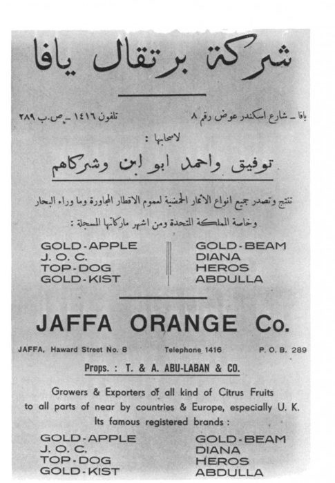 وكانت توجد حتى ما قبل الحرب في فلسطين أربع شركات كبرى تنقل البرتقال إلى موانئ المملكة المتحدة وهي: جمعية مصدري الثمار الحمضية العربية التعاونية، واللتيرس، وبردس، وجافا أورنج سندكيت.. هذا عدا شركات: ورتش ليفانت لاين، وسفنسكا أورينت لاين، وزغلوغا بولسكا.