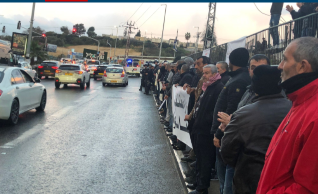 واصطف المتظاهرون على جانبي الشارع رقم 75 الالتفافي بين الناصرة ومدينة نوف هجليل، قبالة البيت الذي تعرض لهدم اجزاء كبيرة منه، الليلة الماضية، من قبل جرافات لجنة التنظيم اللوائية وتحت حراسة قوات كبيرة من الشرطة.