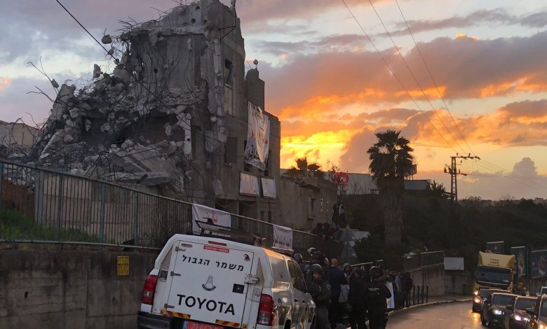 وقد ثبت المشاركون الشعارات المنددة بالسياسات التي تنتهجها السلطات الإسرائيلية، على الجزء العامر من البناية التي تعرضت للهدم الليلة الماضية.