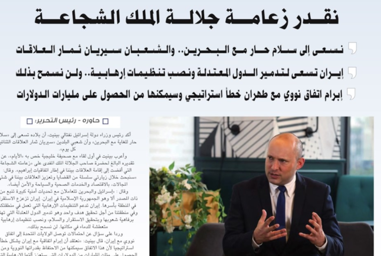 وأعرب بينيت في لقاء مع صحيفة “الأيام” البحرينية”، اليوم الثلاثاء، عن تقديره البالغ لملك البحرين، وقال إن “زعامته الشجاعة أفضت إلى إقامة العلاقات بيننا في إطار اتفاقيات إبراهيم”.