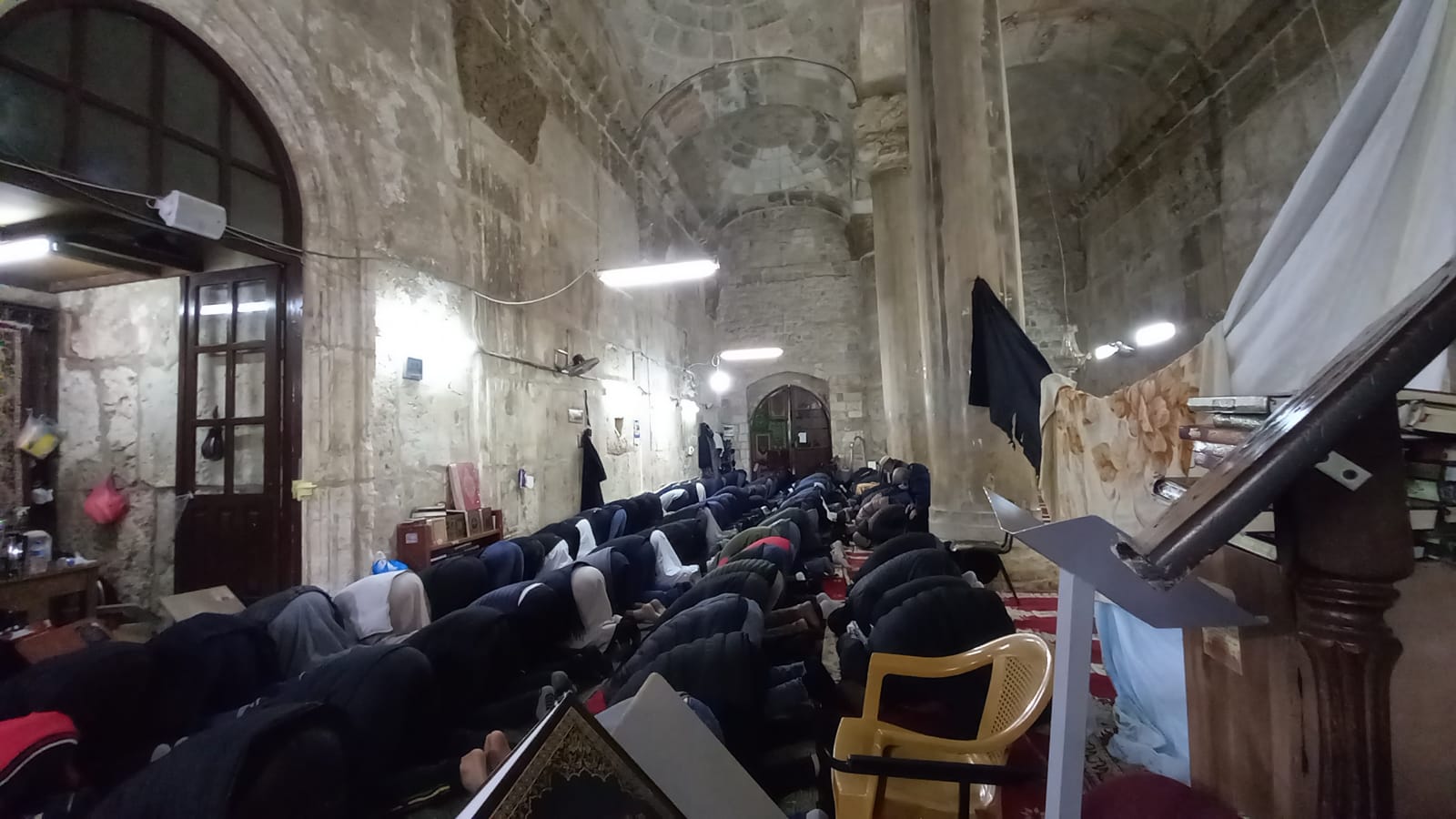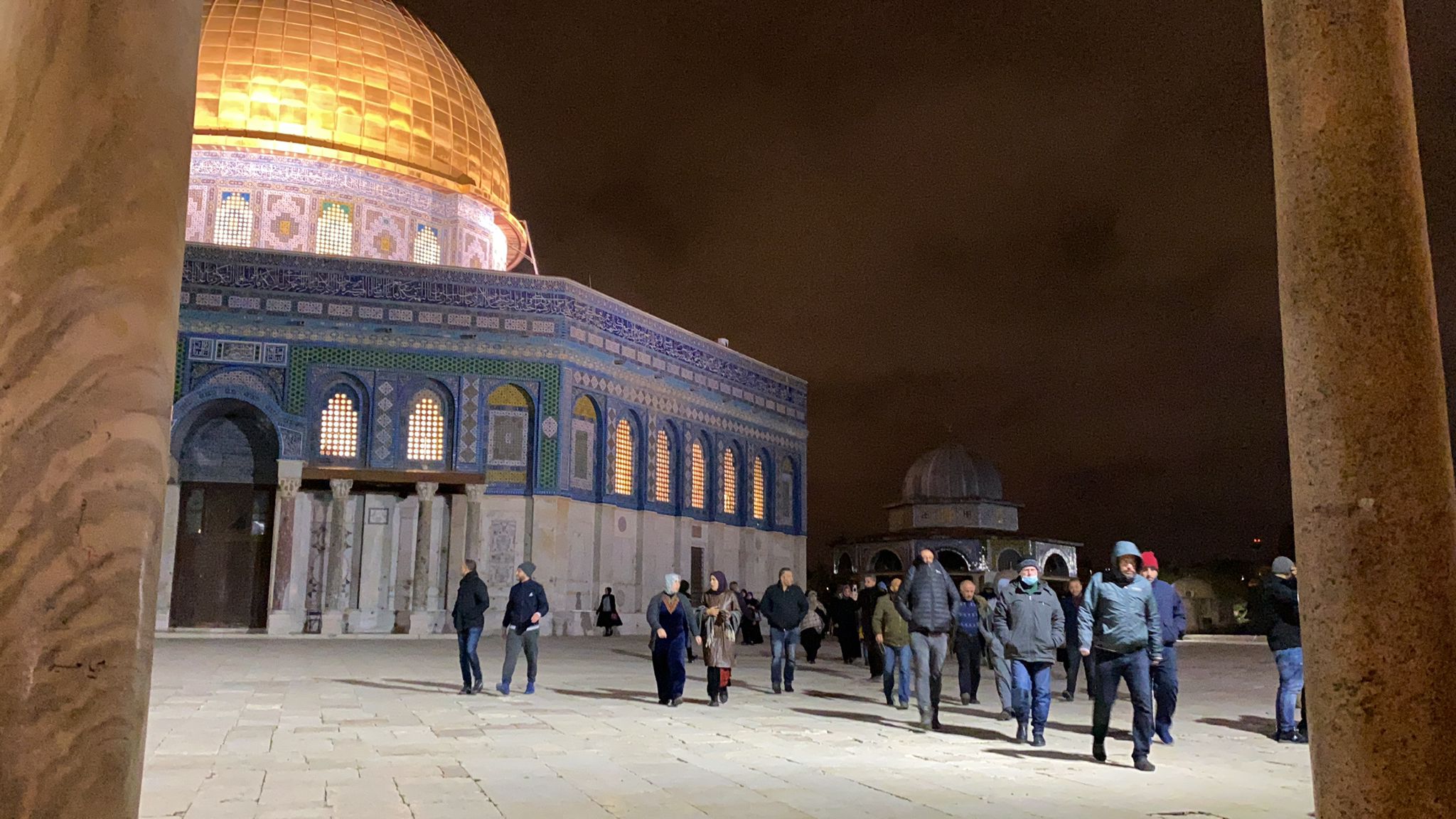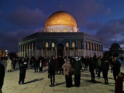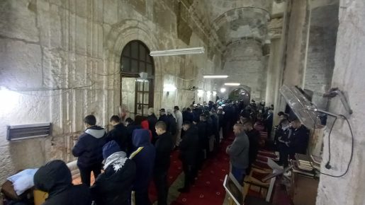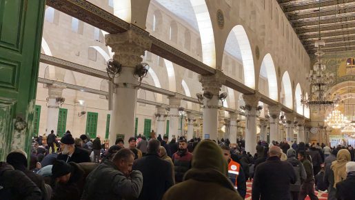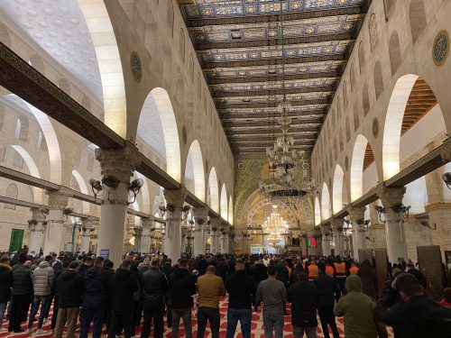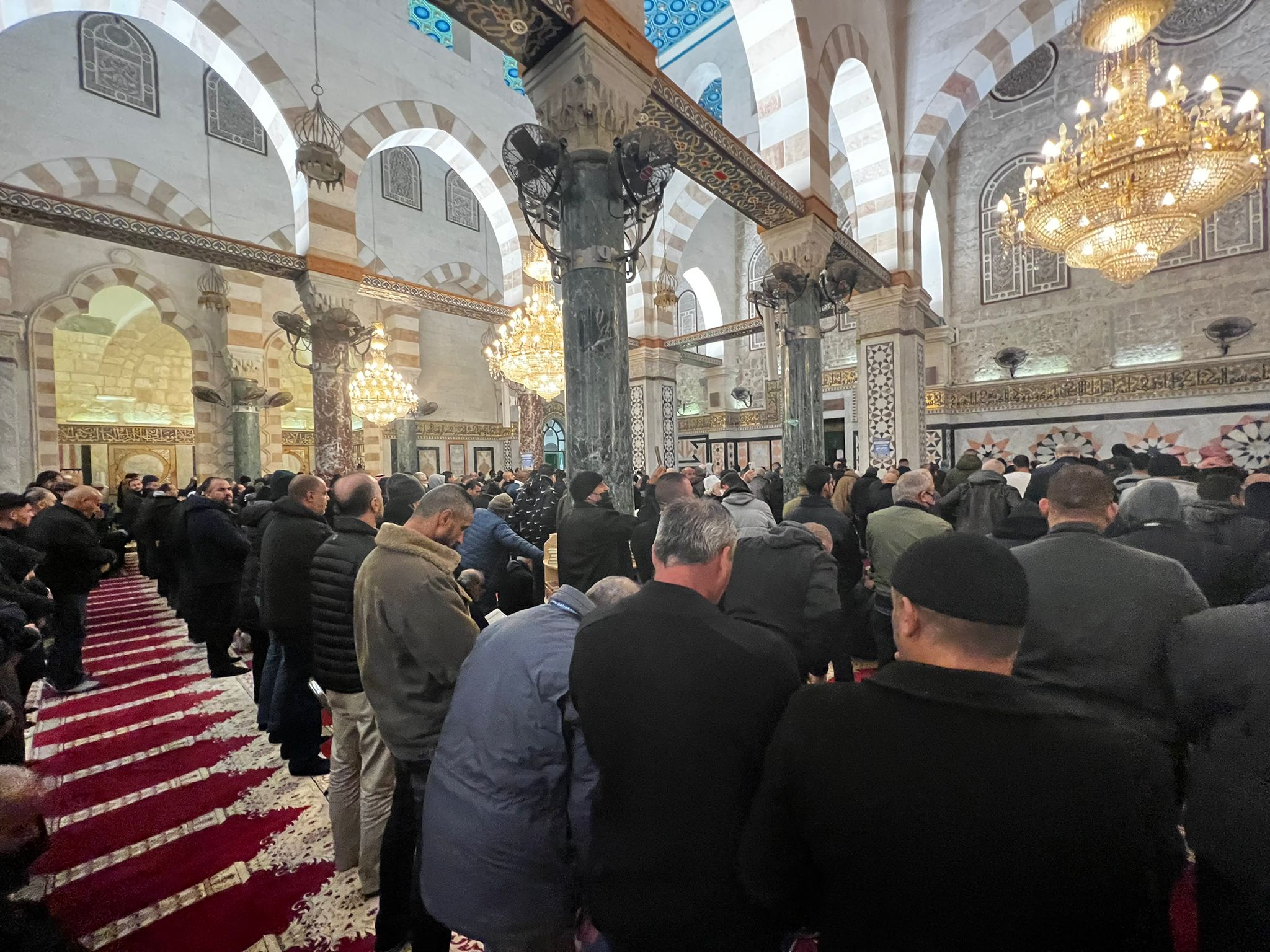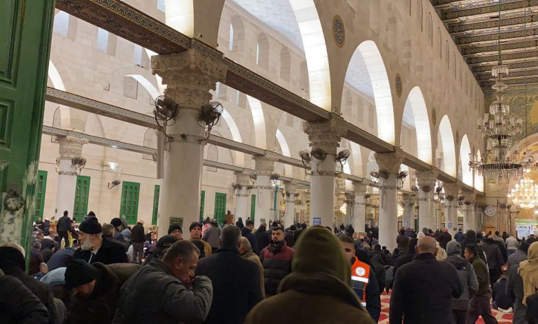 واحتشد آلاف المصلين في المسجد الأقصى المبارك، وامتلأت المصليات المسقوفة بالمصلين بينهم عائلات ضمت نساء وأطفال رغم الأجواء الماطرة والبرد الشديد.