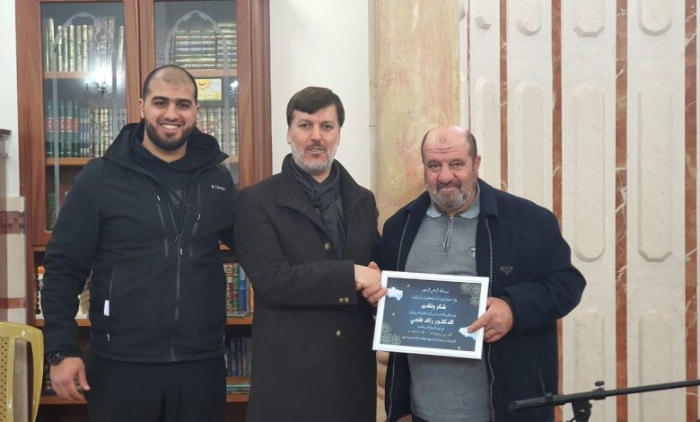 بعد الانتهاء من المحاضرة قُدم لفضيلته درع شكر وتقدير وعرفان على جهوده المبذولة لحضوره لتقديم المحاضرة، حيث قام بتسليمه الشيخ سعيد أسعد خليليه مؤذن المسجد.