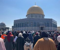 وتشهد باحات المسجد الأقصى المبارك تواجد عشرات آلاف المسلمين الذين شدّوا الرحال للمسجد الأقصى المبارك احتفالًا بذكرى الإسراء والمعراج.
