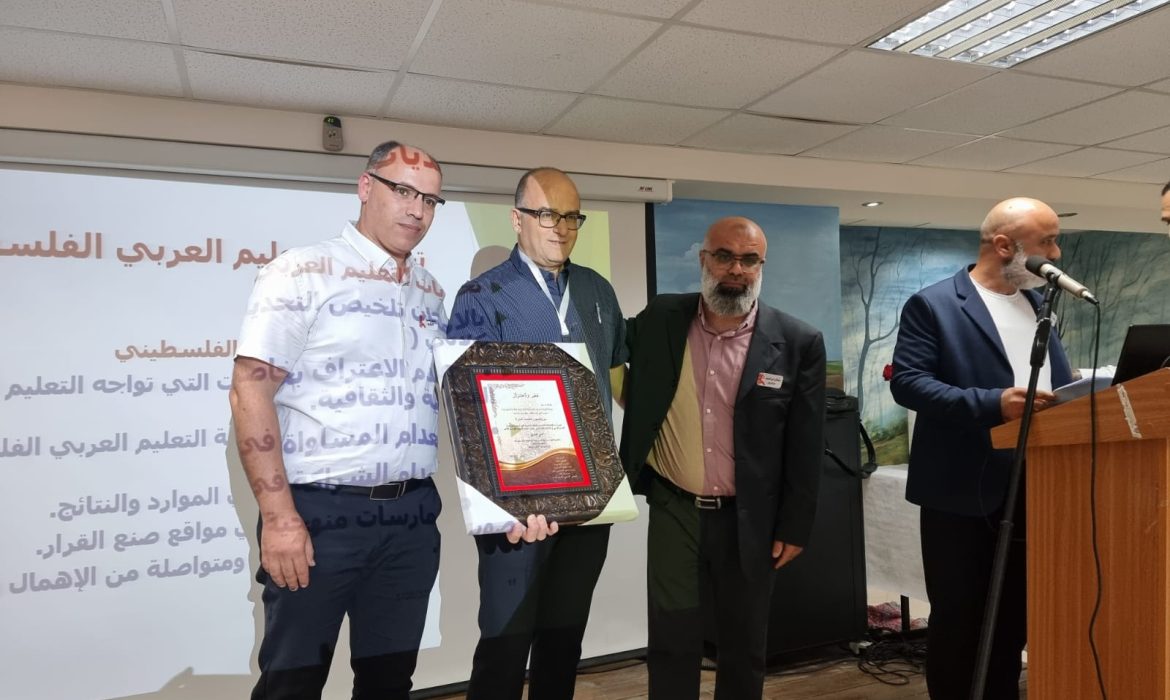 في ختام كلمته قام المنظمون بتكريم بروفيسور محمد أمارة من خلال هدية رمزية تقديرا لجهوده ونشاطاته العلمية والبحثية خدمة لمجتمعه وهويته، لا سيما إصداره الأخير “لغتي هويتي”.