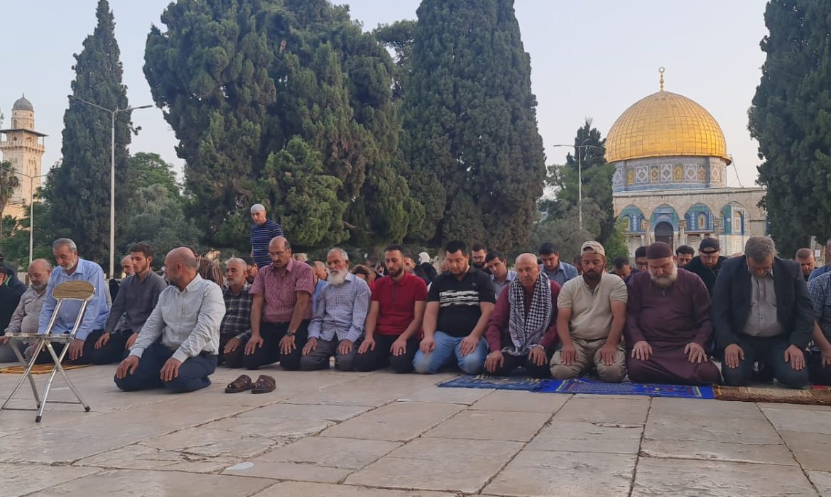 وفي تحدٍ لقوات الاحتلال، شرعت مجموعة من المصلين في أداء صلاة الضحى الجماعية في باحات المسجد.