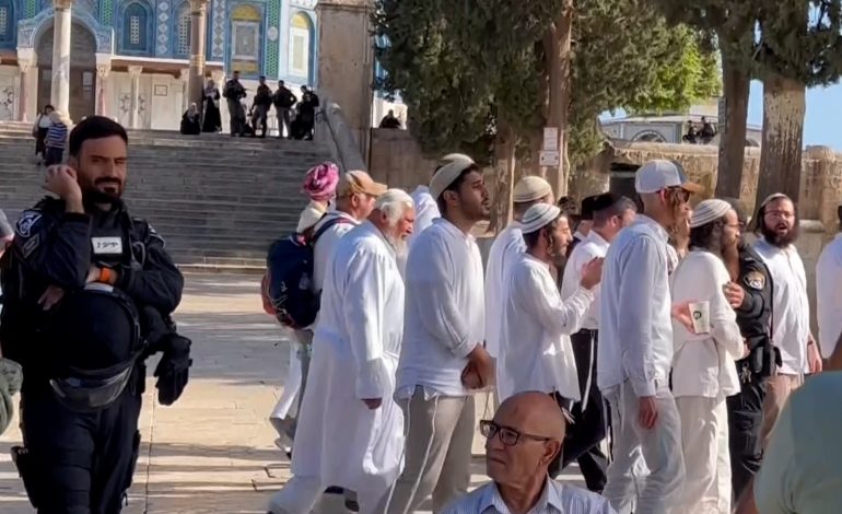 وأشارت إلى أن “المستوطنين نفذوا جولات استفزازية، وأدوا طقوسًا تلمودية عنصرية في باحاته، واستمعوا لشروحات مزورة عن ’هيكلهم‘، تحت حماية شرطة الاحتلال”.