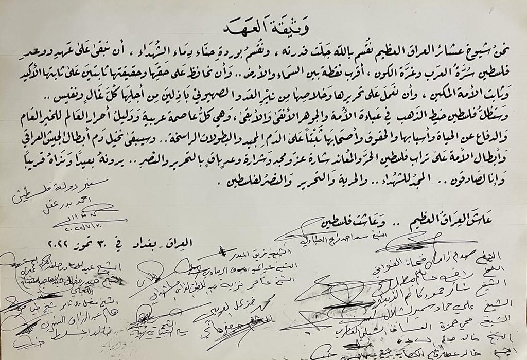 ووقع شيوخ من عشرين عشيرة عراقية الوثيقة خلال زيارتهم مقر سفارة دولة فلسطين لدى العراق ولقاء السفير أحمد عقل، أكدوا من خلالها أن عشائر العراق “ستبقى على عهد فلسطين وتحافظ على حقها وحقيقتها وتعمل على تحريرها وخلاصها من الاحتلال”.