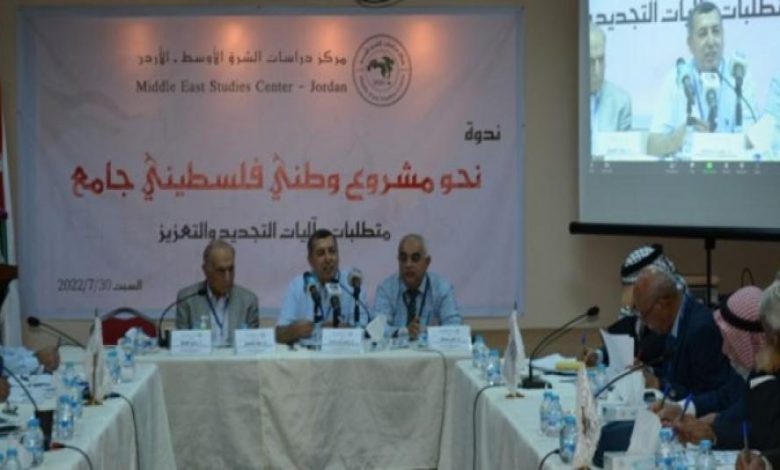 توصل مشاركون في ندوة علمية عقدها مركز “دراسات الشرق الأوسط” في العاصمة الأردنية عمان، أمس السبت، بعنوان: “نحو مشروع وطني فلسطيني: متطلبات وآليات التجديد والتعزيز” إلى ملامح مسوّدة المشروع الوطني الفلسطيني، لتقديمه إلى كافة صناع القرار في الشأن الفلسطيني رسميًّا وفصائليًّا، بعد الانتهاء من صياغته النهائية بهدف المساهمة في الدفع نحو تحقيق أهدافه من التحرير وإنهاء الاحتلال وتحقيق العودة وبناء الدولة.