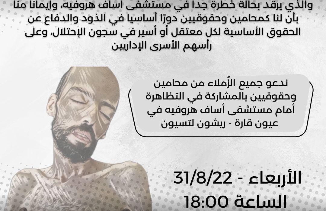 وقالت في بيان أصدرته بالمناسبة: “إننا ندعو جميع الزُملاء من محامين وحقوقيين بالمشاركة في التظاهرة أمام مستشفى أساف هروفيه في عيون قارة (ريشون لتسيون) الأربعاء، 31.8.2022، في الساعة 18:00، لنرفع صوتنا عاليا دعما لنضال الأسير عواودة واحتجاجا على منظومة الاعتقال الإداري المقيتة”.