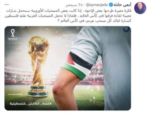وكتب جادة عبر موقع (تويتر) متسائلاً: “فكرة معبرة طرحها بعض الإخوة، إذا كانت بعض المنتخبات الأوروبية ستحمل شارات معينة لقادة فرقها في كأس العالم، فلماذا لا تحمل المنتخبات العربية علم فلسطين كشارة لقائد كل منتخب عربي في كأس العالم؟”.