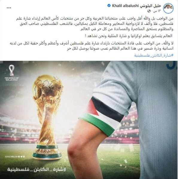أما المعلق العماني خليل البلوشي، فكتب عبر حسابه الرسمي على موقع (فيسبوك): “من الواجب بل والله أقل واجب على منتخباتنا العربية وكل حر من منتخبات كأس العالم ارتداء شارة علم فلسطين، فلا وألف لا لازدواجية المعايير ومعاملة الكيل بمكيالين، فالشعب الفلسطيني صاحب الحق والمظلوم يستحق المناصرة والمساندة من كل حر في العالم”.
