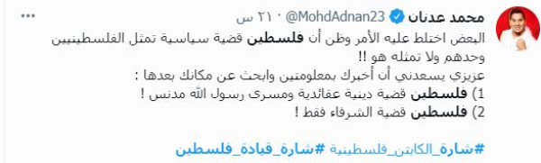 فيما كتب الإعلامي الشهير وصانع المحتوى الرياضي، الفلسطيني محمد عدنان عبر موقع (تويتر) متعجباً: “البعض اختلط عليه الأمر وظن أن فلسطين قضية سياسية تمثل الفلسطينيين وحدهم ولا تمثله هو !!”