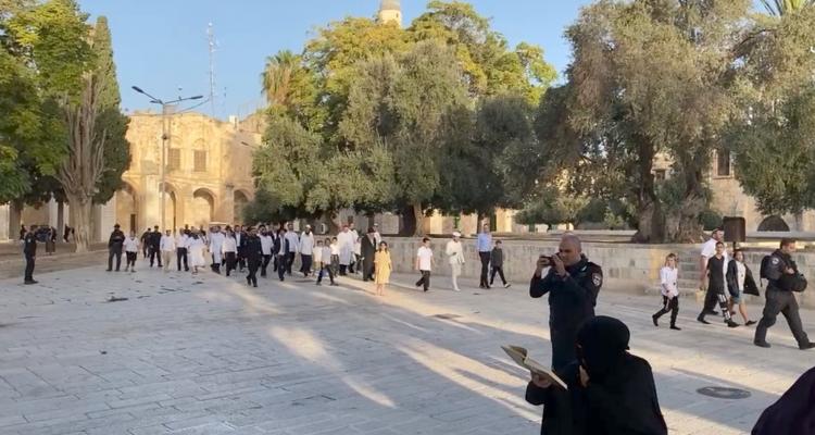 وأفادت الأوقاف الإسلامية في القدس بأن عشرات المستوطنين على شكل مجموعات متتالية اقتحموا المسجد الأقصى المبارك، وأدوا طقوسا تلمودية عنصرية وجولات استفزازية، تحت حماية مشددة من شرطة الاحتلال.