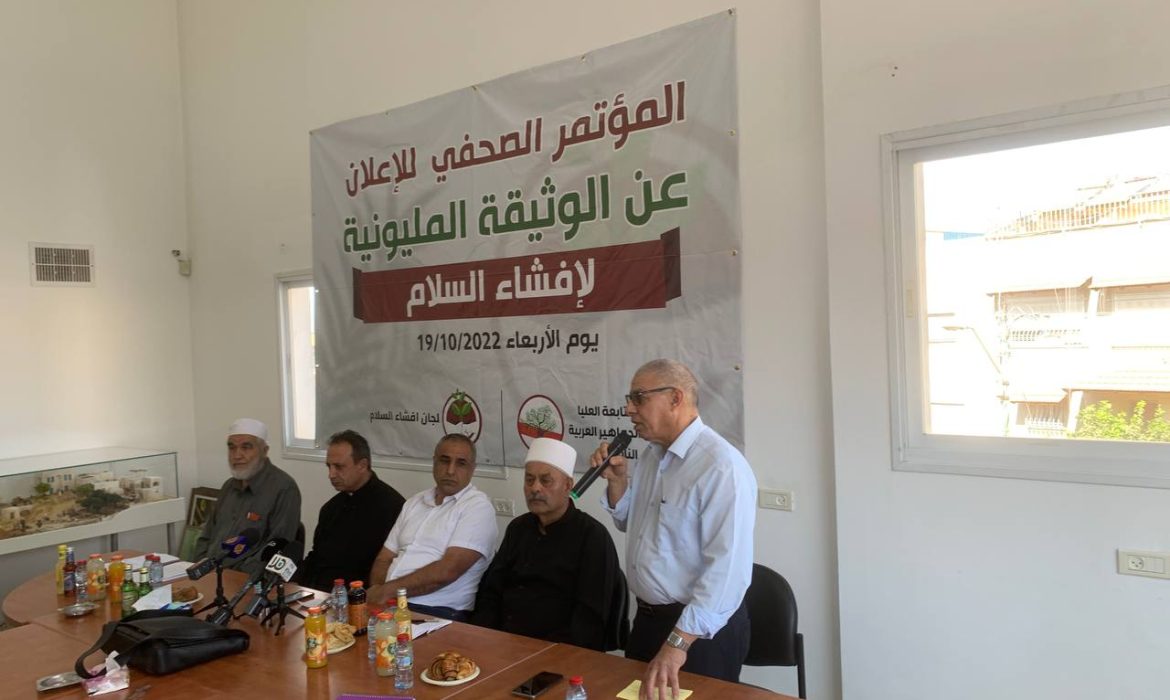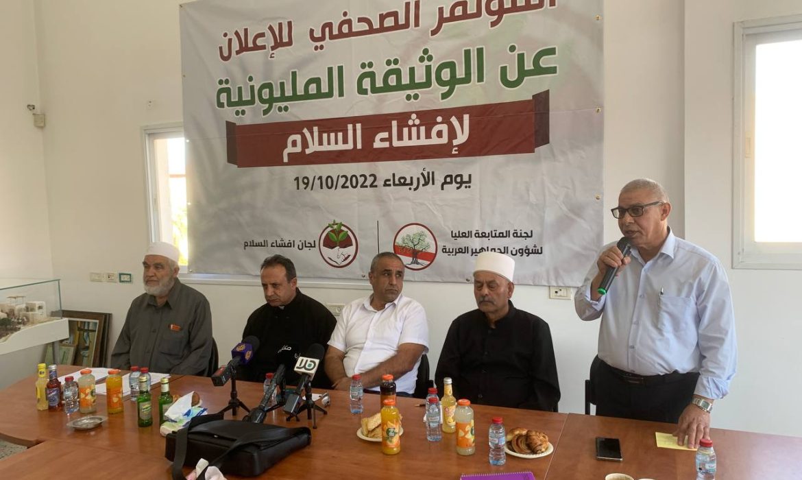 أطلقت لجان افشاء السلام في الداخل الفلسطيني المنبثقة عن لجنة المتابعة العليا، اليوم الأربعاء، حملة التوقيع على الوثيقة المليونية لإفشاء السلام والتي تطالب المؤسسة الإسرائيلية القيام بواجبها تجاه مكافحة العنف في المجتمع العربي كما دعت المؤسسات الدولية وفي مقدمتها الأمم المتحدة للضغط على الحكومة الإسرائيلية لمحاربة العنف والجريمة، وحذّرت الوثيقة أنه في حال عدم استجابة الحكومة الإسرائيلية سيضطر أبناء الشعب الفلسطيني في الداخل إلى طلب الحماية الدولية.