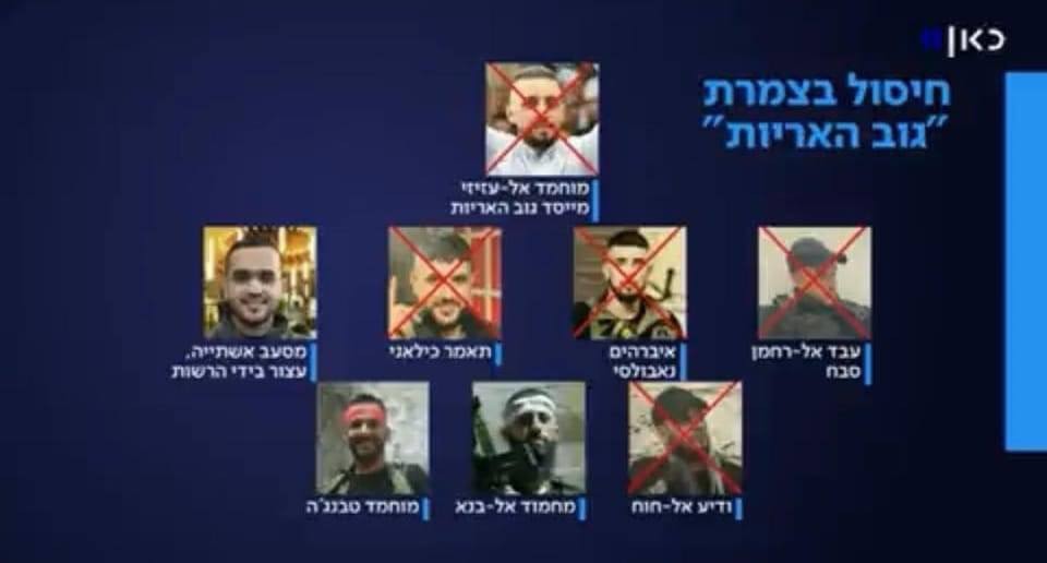 نشرت قناة “كان” العبرية”، الليلة الماضية، صورة عبر قناة التلفزة التابعة لها، يظهر فيها قادة مجموعة” عرين الأسود”، ومنهم من تم اغتاليه.
